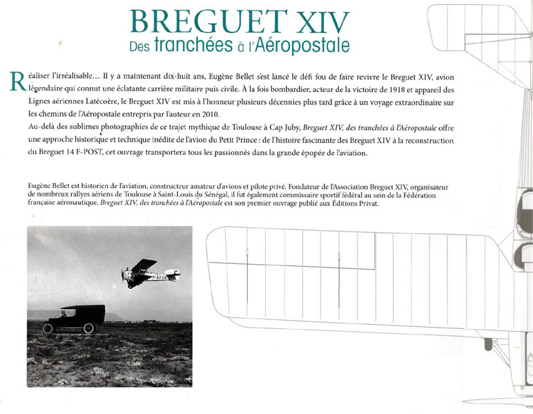 La passion d'Eugène Bellet pour le Breguet XIV nous vaut ce très bel ouvrage qui rend un juste hommage à cet avion de légende aux grandes qualités intrinsèques, à son concepteur et aux nombreux utilisateurs français ou étrangers qui, en temps de guerre comme en temps de paix, avec ou sans armes, ont accompli d'exigeants devoirs, ouvert des voies et repoussé au-delà de l'imaginable les champs du possible.